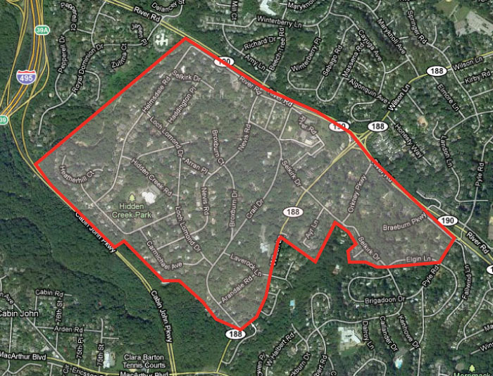- Southern boundary: Cabin John Regional Park behind properties on south side of Carmichael Avenue and south side of Broxburn Drive